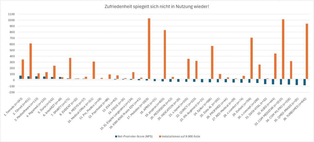 Trotz teilweise sehr schlechter Bewertungen halten viele Ärzte an ihrem Praxisverwaltungssystem fest. Die am schlechtesten bewerteten Systeme haben mit die höchsten Nutzungszahlen. Oder andersherum: 2/3 der Ärzte arbeiten mit Systemen, die sie anderen nicht empfehlen würden. Gerade deshalb war diese Untersuchung überfällig! Denn das erklärt den Frust vieler Ärzte und ÄrztInnen mit ihrem Praxisverwaltungssystem.